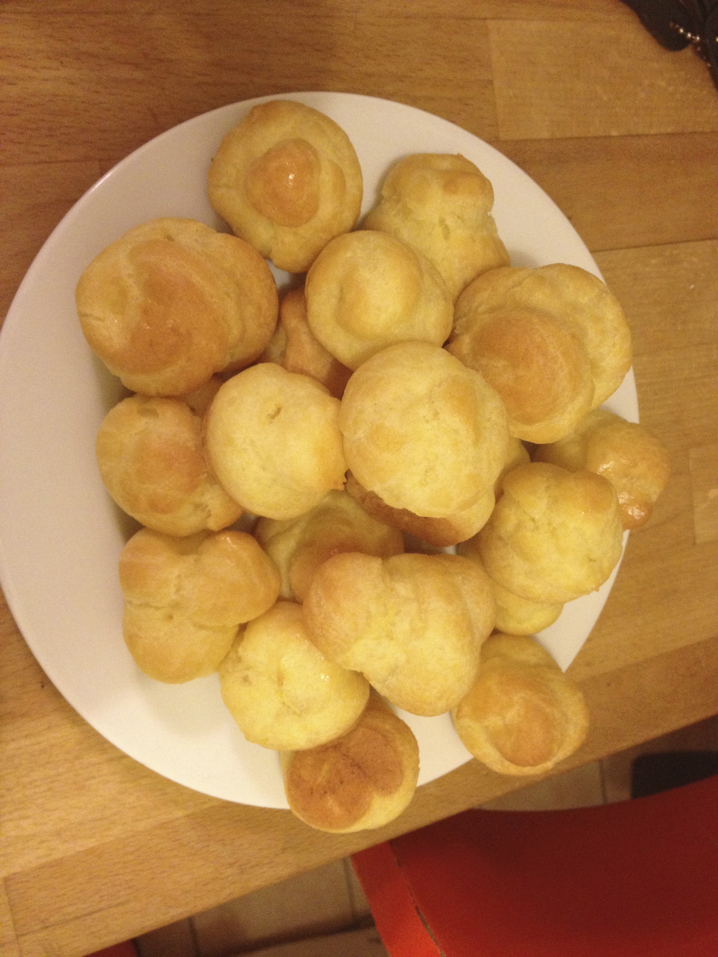 At the other end of the spectrum from Jennie June’s historic lard puffs, I found a twenty-first century recipe on the internet that promised perfect choux through the test-kitchen approach to baking made famous by Chris Kimball. The measurements were specific: 85 grams of butter, 115 grams of flour, 200 ml water, you get the drift. (Confession: the recipe came off the BBC website, hence the metric measurements.) This ultra-modern approach complicated things further by demanding that the flour/butter paste rest for ten minutes before the addition of the eggs. Then, for the coup de grâce, came the innovative direction to pour a cup full of water into a baking pan  on the oven floor when the pâte went in, to provide steam and make the pastry rise better. Surely with such a detailed set of instructions we could not go wrong! But I had my suspicions when the pâte pooled like macarons on the baking sheet rather than holding its shape. Maybe Maya measured wrong, maybe she stirred too little, maybe we took the pâte off the heat too soon. Unfortunately, the end results weren’t profiteroles. At least they were tasty. Maya named them profiter-pancakes.