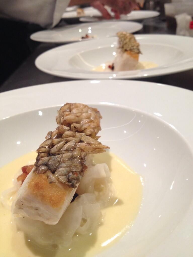 Next came a dish of seared scallops with tiny slivers of apple and jambon de boeuf, a cured beef from Galicia similar in style to Spanish ham. A point of disagreement: this was le rosbif’s favorite dish, and my least favorite. Our disagreement can be explained by le rosbif‘s greater sweet tooth – he’s English after all. Le rosbif – who typically does not like scallops – found the dish wonderfully fresh, tender, and toothsome; for me, the sauce was too sweet. Well not so sweet that I didn’t eat it all up. Just if I had to rank the dishes in order, this to me was the least interesting.