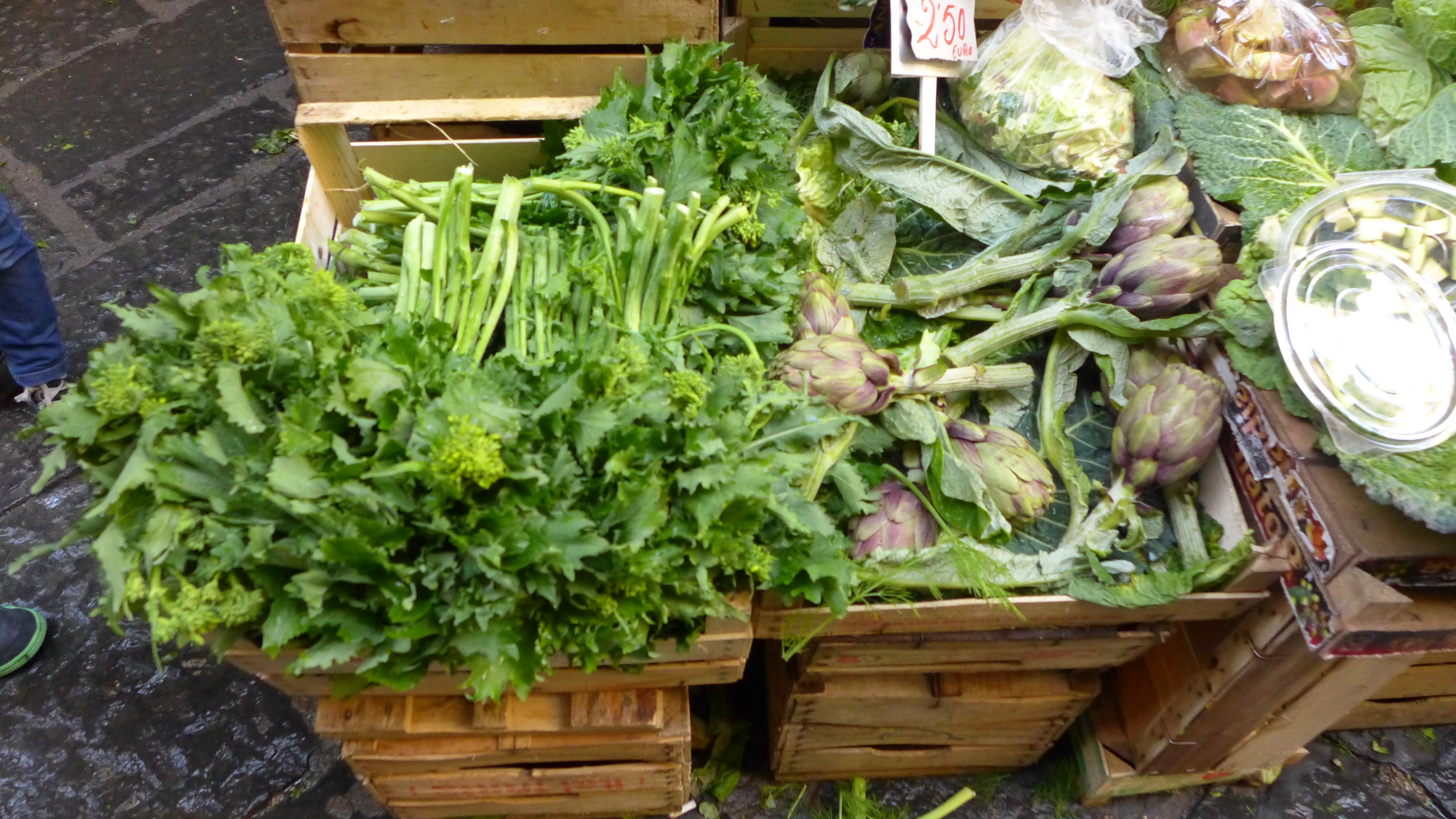 After we arrived in Napoli on a Friday morning (following an inexpensive crack-of-dawn flight from Paris), we spent our first day wandering the streets of the old part of the city, where we had booked a hotel room. Soon we regretted that decision. Gazing with greed upon the trays of live vongolegamberetti, polpi, and calamari, I wished with all my might for a kitchen. The clams have gone up in price since Twain’s time, but the prices in Naples are still a welcome change from Paris. The turgid violet artichokes, €2.50 a bunch, were a steal. I cried bitter tears of longing over the heaps of vivid green rapini. Within an hour of our arrival we were making plans for our return – next time to an apartment with a stove.