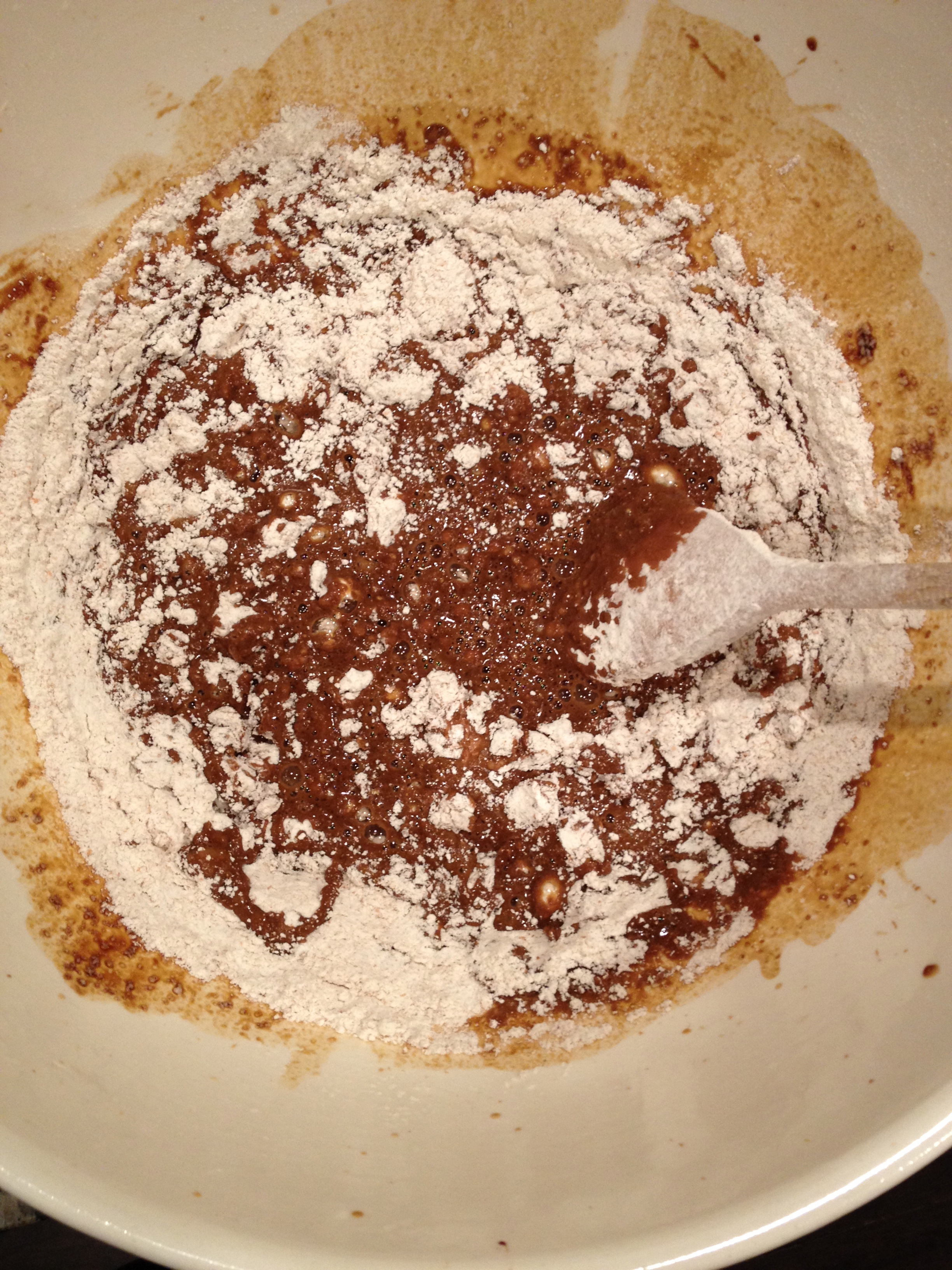 After beating the two together with my historic orange silicone spatula, I added 1 ½ cups of warmed milk. The recipe suggested between 1 ½ and 2 cups. In retrospect I wish I had added the full two cups, it may have made for a more pliable dough when, after mixing in my gill of yeast (two and a half tablespoons, activated in a quarter cup of warm water with a tablespoon of sugar), I next added a full two quarts (8 cups) of whole wheat flour. I thought about adding extra bran for effect, but we were out and besides, the flour I used was plenty full of roughage.