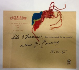 I found this cutting from the scarf that killed Isadora Duncan attached to an envelope in a clippings binder at the Bibliothèque Nationale in Paris. The caption reads “shawl of Isadora Duncan at the moment of her death.”